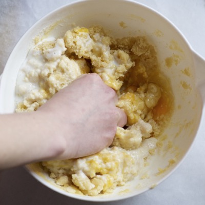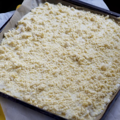 Valmista piirakka: Sulata voi. Yhdistä kuivat aineet ja lisää ne sulaan voihin. Sekoita tasaiseksi. Ota kolmasosa taikinasta erilleen sivuun. Lisää isompaan taikinamäärään yksi kananmuna ja 2 dl piimää. Sekoita tasaiseksi. Tasoita taikina leivinpaperoidulle uunipellille.