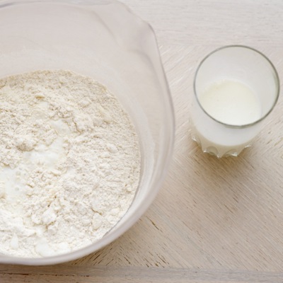 Sekoita kuivat aineet keskenään. Nypi kylmä voi kuivien aineiden joukkoon murumaiseksi seokseksi. Lisää piimä ja sekoita nopeasti juuri ja juuri sekaisin. Älä vaivaa! Taikinan tulee olla märkää. Lisää piimää tarvittaessa.