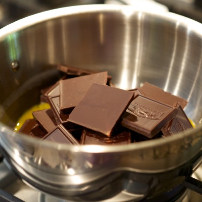 Sulata pilkottu suklaa keltuaisten kanssa kattilassa miedolla lämmöllä koko ajan sekoittaen, kunnes seos on tasaista ja kiiltävää. Kaada seos kulhoon jäähtymään. Vaahdota pehmeä voi ja tomusokeri ilmavaksi vaahdoksi, noin 2-3 minuuttia. Lisää joukkoon haalea suklaa-keltuaisseos ja sekoita nopeasti tasaiseksi vaahdoksi nuolijalla. Tarkista makeus ja maku, lisää sokeria tarvittaessa!