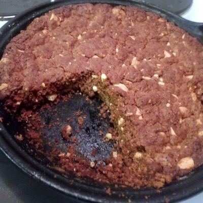 Sekoita tasaiseksi ja painele taikina pannun pohjalle. Laita pannu uuniin ja paista noin 25-30 minuuttia uunin keskitasolla. Voit tarjoilla keksin lämpimänä esimerkiksi jäätelön tai vaniljakastikkeen kanssa. Jättikeksi maistuu herkulliselta myös kylmänä. Jos sinulla ei ole valurautapannua, voit käyttää tavallista paistinpannua ruuvaamalla kahvan pois. Tai vaihtoehtoisesti tee keksitaikina paistinpannulla ja siirrä taikina piirakkavuokaan.
