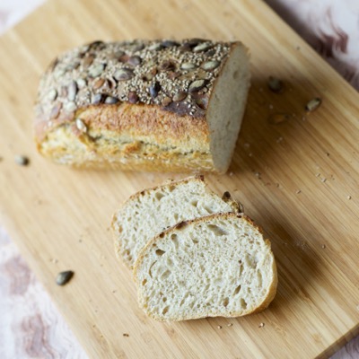 Kotona leivottu leipä on parasta mitä ajatella saattaa. Vaaleaan hapanjuuren leivottu kurpitsa-seesamileipä saa makunsa juuren lisäksi paahdetuista siemenistä. Seesamin- ja kurpitsansiementen maku on parhaimmillaan uunissa paahdettuna, jota rapea kuori ja pehmeä sisus korostaa!
