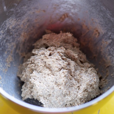 Sekoita kuivahiiva jauhoihin tai liota tuorehiiva piimä-leseseokseen. Lisää piimä-leseseokseen molemmat jauhot ja sokeri. Vaivaa taikinaa koneella 8 minuuttia, käsin 15 minuuttia. Lisää suola ja öljy ja jatka vaivaamista vielä 3 minuuttia. Anna taikinan levätä muovikelmulla peitetyssä kulhossa 40 minuuttia.