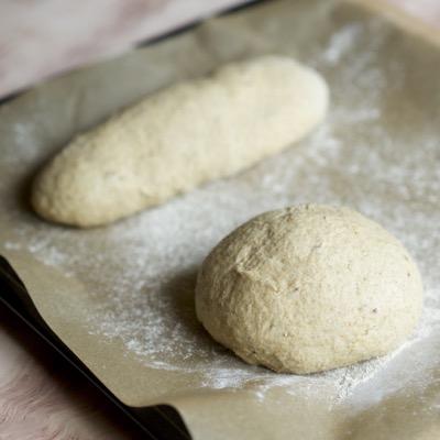 Kaada taikina kevyesti jauhotetulle pöydälle ja vaivaa ilmakuplat rikki. Jaa taikina kolmeen osaan. Pyörittele taikinapalat pöytää vasten joko pyöreiksi tai pitkulaisiksi limpuiksi, jätä saumapuoli alhaalle. Nosta leivinpaperoidulle pellille tai tarvittaessa useammalle pellille. Jätä tilaa kohoamiselle!