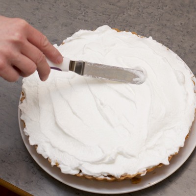 Täytä pohja täysin jäähtyneellä raparperikiisselillä. Valmista marenki ja sivele se raparperikiisselin päälle, niin että koko täyte peittyy sen alle. Vaahdota valkuaiset, lisää sokeri 3 erässä aloittaen valkuaisten ollessa kevyesti vaahdotettuja. Jatka vaahdottamista kunnes valkuaiset ovat marenkia. Marenki on valmis, kun vispilän kuvio jää paikalleen pois nostettaessa. Marenki on myös kauniin kiiltävää. Nosta piirakka vielä uuniin noin 10 minuutiksi, kunnes marenki on ottanut kauniisti väriä pinnasta. Voit polttaa marenkiin kauniin pinnan myös ns. tohottimella, kaasupolttimella.