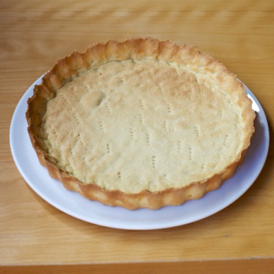 Jauhota pöytä ja kaulin kevyesti. Painele murotaikina joustavaksi pöytää vasten. Muistaa jauhottaa välillä lisää, jotta murotaikina ei jää kiinni pöytään/kaulimeen. Kauli murotaikina noin 3 mm paksuiseksi matoksi, joka on isompi kuin piirakkavuoka. Pyöräytä murotaikina kevyesti kaulimen ympäri ja nosta hyvin voidellun piirakkavuoan päälle. Voit käyttää irtopohjaista piirakkavuokaa, jolloin piirakan saa kauniisti esille ilman vuokaa. Painele murotaikina vuokaan ja trimmaa reunat veitsellä tasaisiksi. Pistele pohja haarukalla, jotta pohjaan ei tulisi ilmakuplia paiston aikana.