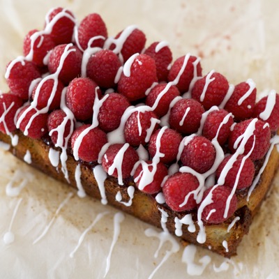 Voitele kakun pinta runsaalla vadelmahillolla. Koristele tuoreilla vadelmilla ja tomusokerikuorrutteella. Sekoita 4 rkl tomusokeria ja tilkka viileää vettä löysäksi tahnaksi.