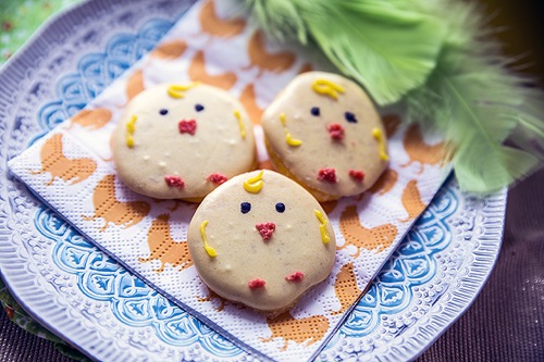 Koristelin macaron-pikkuleivät geeliväreillä. Aloitin nokasta ja sitten jaloista ja silmistä. Viimeistelin keltaisilla yksityiskohdilla, koska ajattelin, että se olisi söpöä – ovathan pienet tipuset kovin pörröisiä.