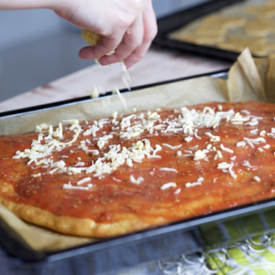 Voitele syvä uunipelti runsaalla oliiviöljyllä reunoja myöten. Voit käyttää myös leivinpaperia ja voidella sen öljyllä. Kaada taikina öljytylle pellille. Taputtele ja venyttele taikina kevyesti uunipellin reunoille asti. Älä pakota taikinaa vaan käytä kevyitä hiukan venytteleviä otteita. Taikinan on tarkoitus olla ilmavaa ja pehmeää, kovat otteet saattavat rikkoa siihen muodostuneet kaasukuplat ja tehdä taikinasta kovan ja tiiviin.