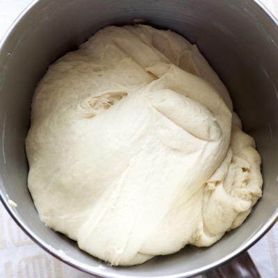 Sekoita kaikki ainekset tasaiseksi taikinaksi. Vaivaa taikinaa kunnes vahva sitkoverkko on muodostunut, noin 15 minuuttia käsin tai 10 minuuttia koneellisesti. Anna taikinan levätä 30 minuuttia, kunnes taikina on kaksinkertaistunut.