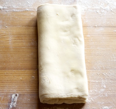 Nosta taikina leivinpaperiin käärittynä leikkuulaudalle ja nosta jääkaappiin lepäämään noin 15 minuutiksi. Kauli taikina levon jälkeen noin 1 cm paksuiseksi suorakaiteen muotoiseksi levyksi. Viikkaa taikina nelinkerroin. Anna taikinan levätä edellisen levon tapaan 15 minuuttia kylmässä.